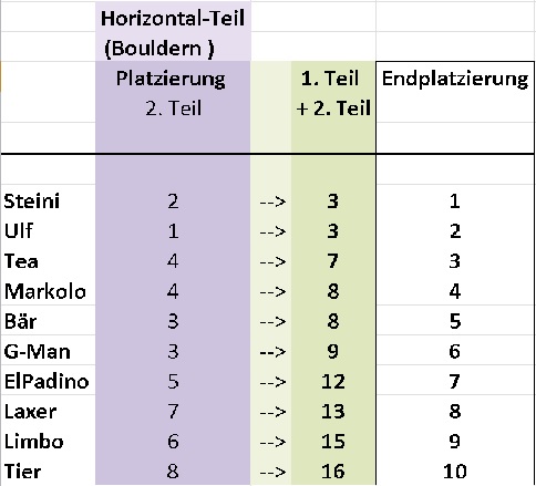 Da beide Kletterteile gleichermaßen über die Platzierung in die Gesamtwertung eingingen, ergaben sich für jeweils Ulf und Steini und für Markolo und Bär Platzgleichstände. Damit wären dann eigentlich zwei Stechen zur Entscheidung angesagt gewesen („Abhängen“: man hängt mit beiden Händen in ausgewählten Griffen und muss so lange wie möglich hängen bleiben. Wer am längsten hängt, hat das Stechen gewonnen), aber aus Zeitgründen wurde von allen vereinbart, dieses Bonmot ausfallen zu lassen und stattdessen die Wertung der schwierigsten Route – die mit dem Überhang – heranzuziehen.