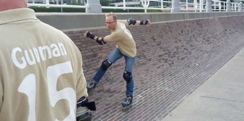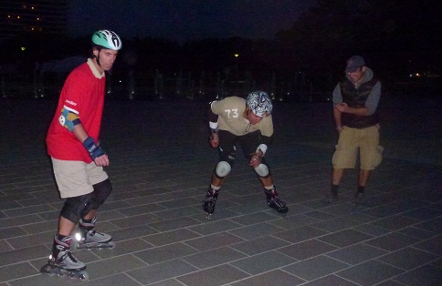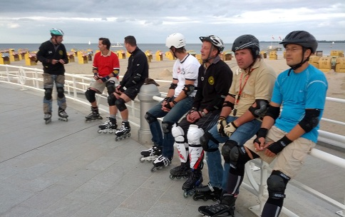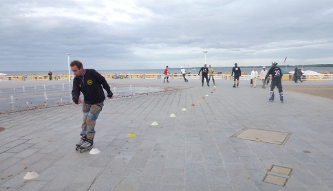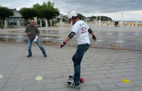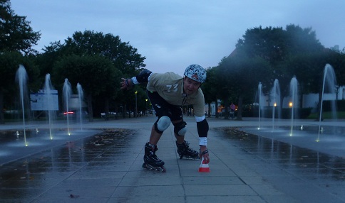 Der Abend bestand aus gleich vier Teildisziplinen: einer Slalomfahrt, einem echten Hindernisparcours mit Geschicklichkeitselementen, einer Sprintstrecke und einem Balanceakt. Schon beim Einfahren wurde deutlich, dass die meisten der Lübecker 12-Kämpfer zu irgendeinem Zeitpunkt vor Ihrer 12-Kampf Karriere schon mal auf den rollenden Kufen gestanden haben. Zum Teil professionelle Protektoren, aber auch Helme, die die eine oder andere Schramme schon mitbrachten wiesen auf Inlinehockeytourniere, Speed Skaten oder gar nationale Halfpipe Events hin. Und auch der übende 12-Kämpfer konnte an diesem Abend nachträglich anhand seiner Skates und der zur Verfügung gestellten Hütchen identifiziert werden. Einzig Gunman und Neumitglied [Marko] brachten am Abend glaubhaft rüber, vor diesem Tag nahezu noch nie die Rollen unter den Füßen gehabt zu haben.