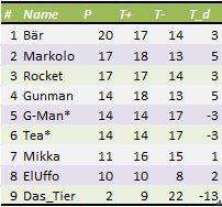 Nach der Hälfte der Saison hat sich ein spannender Kampf um den zweiten Platz hinter Tea (74 Punkte) entfacht. Markolo führt diese Gruppe mit 66 Punkten an und dann folgen mit minimalem Abstand gleich vier 12-Kämpfer: G-Man (62), Bär (61), Rocket (61) und Mikka (60). Doch noch kann alles durcheinander gewürfelt werden. Doch Tea zu überholen scheint schon wieder aussichtslos. Selbst wenn noch die halbe Saison zu spielen ist und Tea im nächsten Wettkampf nicht dabei sein kann. Verglekichsweise gut positioniert, um ihn doch noch aufzuholen, hat sich derzeit vielleicht noch Markolo, der in den vier Wettkämpfen, die er dieses Jahr teilnehmen konnte gleich 3 Mal Zweiter geworden ist. Und 9 mal zweiter hätte bisher in jeder Saison zum Champion gereicht...