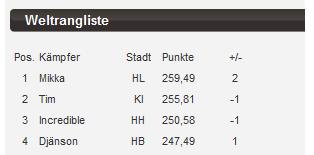 Mit diesem Ergebnis steht erstmalig auch ein Lübecker ganz vorn. Der Club war am 09.09.09 gegründet worden und hat erst 18 Events durchgeführt. Damit wird es aber interessant, denn in der Weltrangliste werden aus den letzten 24 Monate die besten 18 Ergebnisse der einzelnen Kämpfer aufgeführt. Rosige Zeiten stehen also Rocket und W!ESEL bevor, die jetzt schon an die Pforte der Top 20 klopfen und erst 17 (W!ESEL), bzw. 15 (Rocket) Wettkämpfe einreichen konnten.