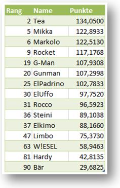 | 100 | Manni | Bremen | 5,34 |