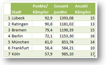 Sucht man nun dennoch nach einem anderen vergleichenden, welches nicht abhängig ist von der Anzahl der Mitglieder pro Club, so bleibt wohl als eine der wesentlichen Größen, die durchschnittlich pro Wettkämpfer erzielte Punktzahl. Sie ist vorrangig ein Indikator für die Wettkampfbeteiligungsquote der einzelnen Clubs. Denn je mehr jeder einzelne 12-Kämpfer an den internen Wettkämpfen teilnimmt im laufenden Jahr, desto mehr Punkte werden auch vergeben. Bei größerer Teilnahme ist jedoch auch der Wettbewerb größer und es ist schwieriger das Podium zu erklimmen. Daher ist dies tatsächlich ein Indikator für die Leistungsstärke der Clubs und der dort ganz vorne stehende 12-Kämpfer. Wenngleich - auch das nur mittelbar. Hier stehen die Clubs aus Lübeck und Ratingen ganz vorn.