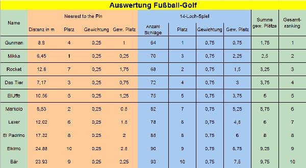 Für die Gesamtwertung wurden die erreichten Platzierungen jedes Teilnehmers unter Berücksichtigung der Gewichtungen addiert, um mit diesen Summen in aufsteigender Reihenfolge das Gesamtranking zu bilden. Die hinteren drei Plätze wurden von Bär, Elkimo und El Padrino belegt. Es ist nicht davon auszugehen, dass der Fußballgolf-Sport diese drei Wettkämpfer nach diesem Event zu seinen Anhängern zählen darf. Ob Deutschlands Fußballgolfanlagen das Angesicht von Laxer, Markolo, ElUffo oder Das Tier wiedersehen werden, bleibt abzuwarten. Da sie mit ihren Plätzen 7 bis 4 solide Leistungen gezeigt haben und bei dem einen oder anderen auch die Lust auf mehr vorhanden zu sein scheint. Der Dritte Rocket und der Zweite Mikka haben offensichtlich auch an dieser Form des Golfsportes sowie dem damit verbundenen Umgang mit dem Spielgerät „Fußball“ nicht nur viel Spaß gehabt, sondern sind mit ihren Leistungen sicher auf dem Podium gelandet. Die beiden mussten lediglich Gunman den Vortritt lassen, der dieses Event für sich entschied und damit ab heute ein grünes Jacket – zumindest virtuell – mehr in seinem Schrank hat.