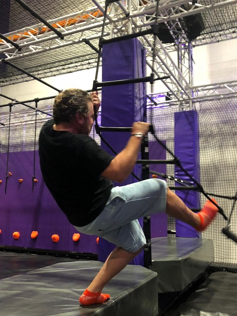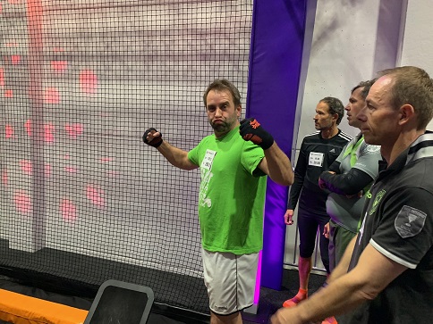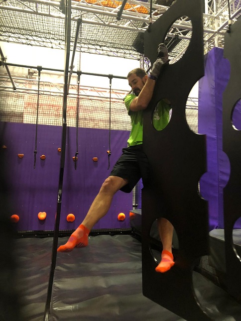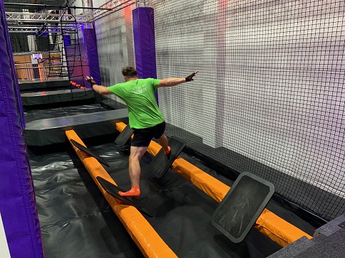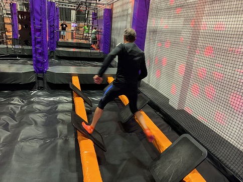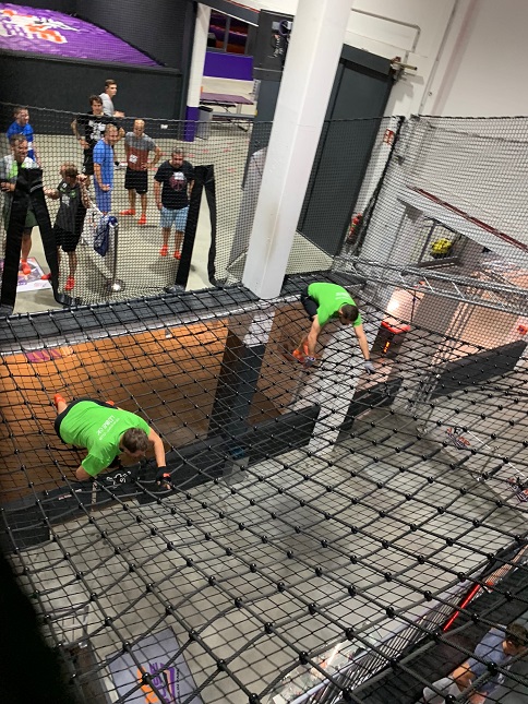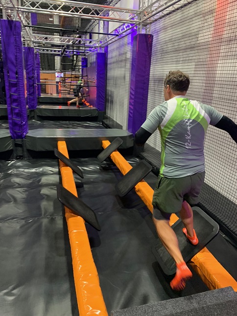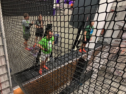 In 1,5 Stunden sollten sämtliche 5 Parcours von jedem Teilnehmer je 3x (Training und 2 Wertungsläufe) absolviert und einzeln gewertet werden. Nach einer kurzen lustigen Aufwärmphase durch den Jump House Animateur ging es Richtung Ninja Box. Die oberen Parcours 3 und 4 standen zur Parallelnutzung zur Verfügung, so dass nach kurzer Losung der Startreihenfolge in zwei Startgruppen die Trainingsläufe in Anti-Rutsch-Socken begonnen werden konnten.