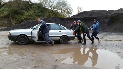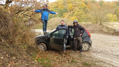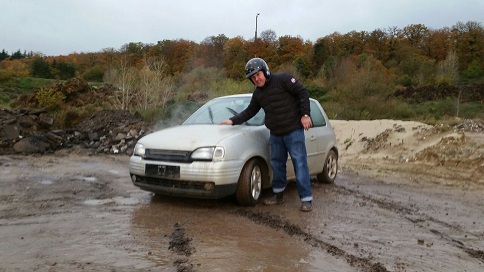 Markolo hatte wieder einmal eine Kiesgrube über seinen alten Studienkollegen Volker aufgetan und in eine anspruchsvolle Rennstrecke umfunktioniert. Auf einer von Volkers Planierraupen ein paar Tage zuvor präparierten Freifläche sollte eigentlich mit Hilfe einer Vielzahl von Pylonen ein Slalomparcour aufgebaut werden. Leider war jedoch die Zufahrtstraße zu der Fläche durch den tagelang andauernden Regenfall so aufgeweicht, dass ein Hinkommen und somit die Nutzung der Fläche unmöglich war.
