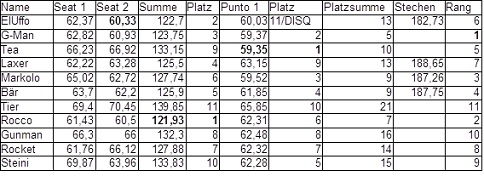 In Einstimmigkeit der Ausrichter samt Scoreboarder wurde nun für die Punto-Wertung nur der erste Wertungslauf herangezogen. Zudem wurde ElUffo aufgrund des vermeidbaren Unfalls und der Folge, dass der 2.Wertungslauf nicht durchgeführt werden konnte, auf den letzten Platz der Punto-Wertung, unter Beibehaltung der gefahrenen Zeit des ersten Durchgangs im Falle eines Stechens, zurück versetzt.