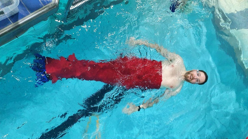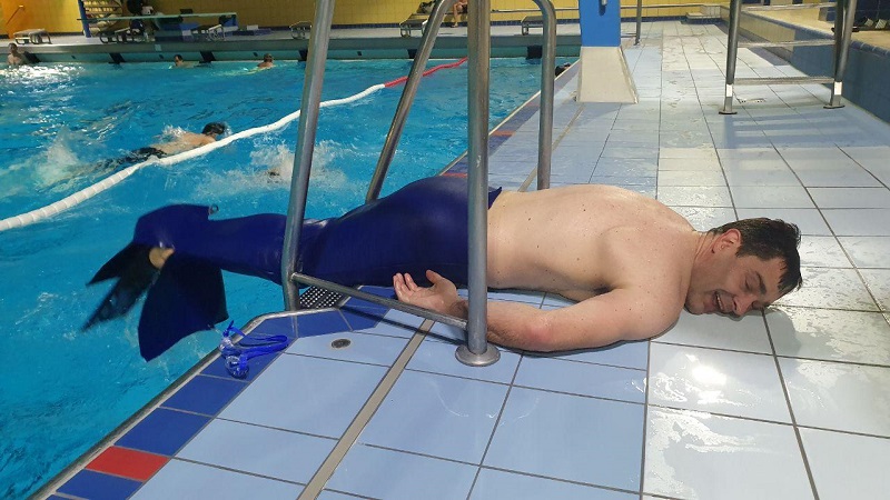 Wettkampf zwei war „Flucht vor Papa Poseidon“. Dabei ging es darum, das 25m Becken mitsamt des Stoffteils, welches den Körper vom Bauch bis zur Fußspitze umschlang und den Flossen so schnell wie möglich zu durchqueren. Mehr Spektakel als Augenschmeichler was an alternativen Schwimmstilen geboten wurde – alles um schnell zu sein. Jeder hatte zwei Versuche. Der schnellere wurde gewertet. Einige der Jungs sind derzeit in der Ironman-Vorbereitung und werden von Sandra Völker trainiert. Doch muss es noch einen Unterschied geben zwischen Meerjungfrauenschwimmen und dem was Sandra den Jungs versucht hat zu vermitteln … Ganz gleich. Damn-Oh und Tier legten mit 19,98 und 23,93 Sekunden vor und setzten den ersten Orientierungspunkt. Denn bis vor ihrer Bahn hatte niemand eine Idee, wie lange das dauern würde oder ob man nicht ohnehin etrinkt bei der Hälfte. Letzteres war schließlich nur bei „The Mole“ zu befürchten, der nach seinen 29,32 Sekunden auch nicht noch mal starten wollte. Währende sich alle übrigen zwischen 19 und 22 Sekunden einpendelten, pflügte plötzlich Blauwaljungrau Mikka durchs Wasser. Sinusartige Flossenbewegungen und eine Bugwelle wie bei U97 kurz vor dem Tauchgang spuckten ein 16er Zeit aus. Liga für sich. Auf Rang zwei schon wieder Elkimo mit frühstartgestützten 18,58 Sekunden und Damn-Oh! de als mit 19,98 Sekunden noch als letzter eine Zeit unter 20 einreichte.