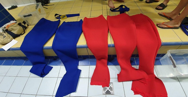 Doch wie macht man aus den Herren der (12-Kampf)-Schöpfung so anmutige Geschöpfe wie Meerjungfrauen? Zudem die Lübecker Prachtexemplare in Länge und Breite sich keiner Norm unterwerfen wollten? Rocket hatte sich etwas überlegt und die Elastizität von Neopren ist ein Geschenk! Gemeinsam mit seiner Frau war er gedanklich alle Staturen der Lübecker Athleten durchgegangen und hatte sie grob in zwei Gruppen sortiert: Blau und Rot, wer böse ist hätte gesagt: Dick und Dünn. Und Rocket war böse. Er hat es gesagt.