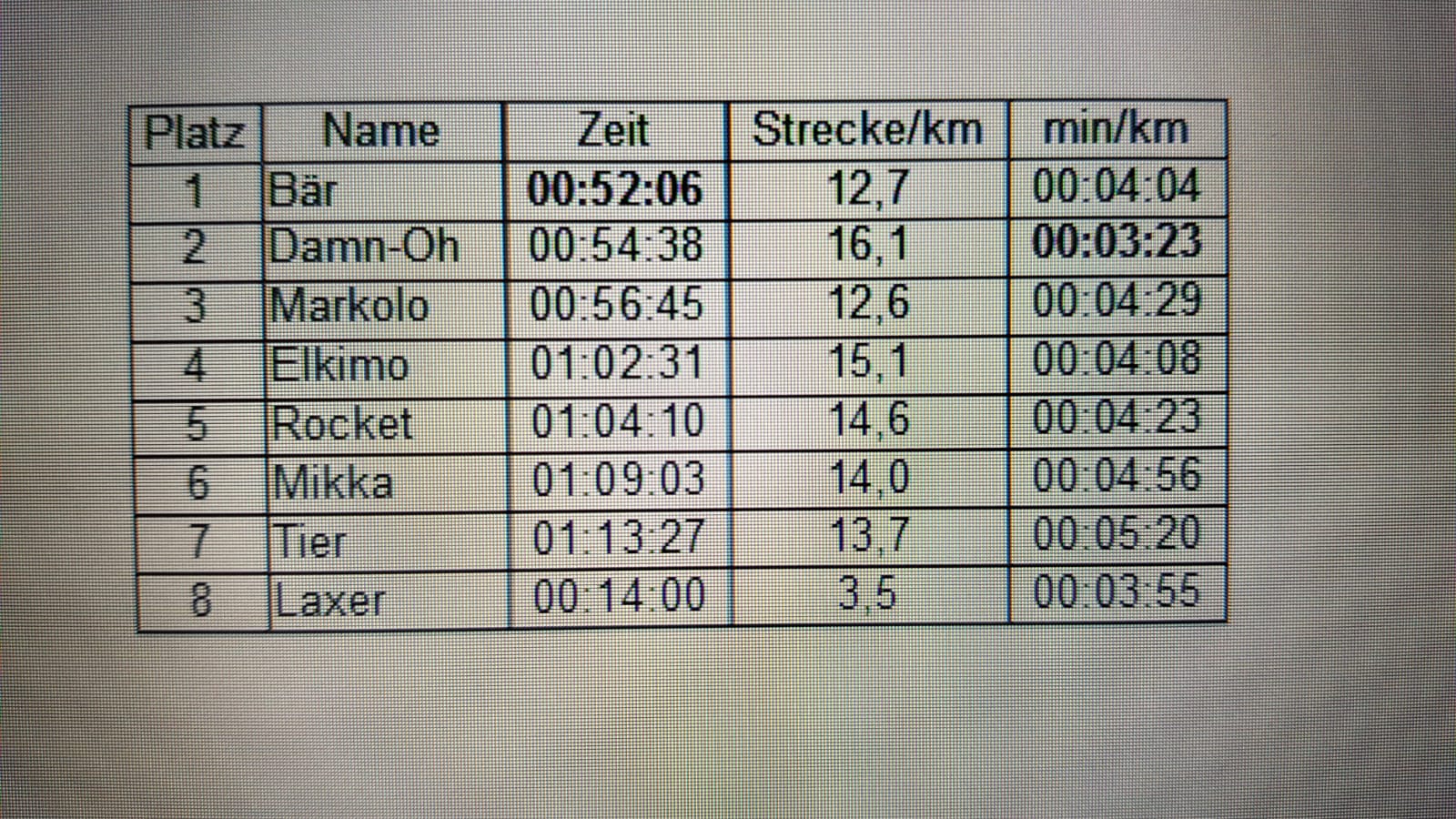 Offensichtlich mit dem besten Mix aus Leistungsfähigkeit und Strategie, in Bezug auf Geschwindigkeit und Aufmerksamkeit, überquerte Mitfavourit Bär nach 52 Minuten, ohne von der vorgegebenen Strecke abgekommen zu sein, als Sieger die Start- und Ziellinie am Parkplatz Tirol. „Am Anfang hatte ich noch Ehrgeiz, am Ende wollte ich nur noch ankommen“, sagte er mit Bezug auf die Strapazen. Die tägliche Fahrradfahrt zur Arbeit hat beim konditionellen Durchhalten sicherlich geholfen.