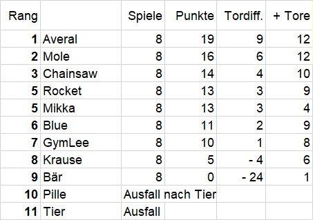 Im Turnier selbst ließ Averell nichts anbrennen. Ökonomisch clever und hinten "zu" ließ er praktisch nichts gegen sich zu, erreichte 19 Punkte aus nachher nur noch 8 gewerteten Begegnungen. Durch Verletzung mussten drei Spieler das Turnier vorzeitig beenden. Souverän löste er auch das direkte Duell gegen Mole. Dieser setzte sich ebenfalls noch deutlich ab, 16 Punkte waren sein Ergebnis. Die Pätze 3 - 5 dagegen entschied nur ein einziger Punkt. Den hatte Chainsaw mehr als Rocket und Mikka. Und bei den letzten beiden musste es dann die Tordifferenz lösen.