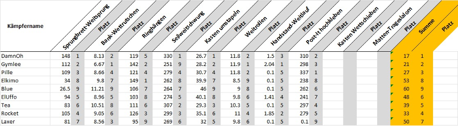 Zehn Disziplinen, die selbst Olympioniken ins Schwitzen gebracht hätten, standen zunächst auf dem Programm. Von Weitsprüngen, die an Flugversuche erinnerten, bis zu Handstandläufen, die eher kurz ausfielen. Einigen gelang sogar das Kunststück Minusmeter auf ihren Boards eintragen zu müssen. Aufgrund von Zeitmangel mussten Kastenwettschieben und Mattentrageslalom gestrichen werden. Am Ende war es also ein 8-Kampf!