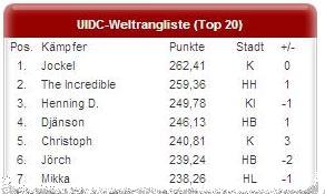 Mit dem aktuellen relaunch der UIDC Seite [http://www.uidc.de] sind auch die Weltranglistenergebnisse für den September veröffentlicht worden. Durch die erstmalig aufgeführten 12-Kämpfer des 12-Kampf Teams Lübeck wurde die Rangliste auf nun 135 Kämpfer erweitert. Ein Lübecker 12-Kämpfer liegt gleich in den Top 10 der Welt. Morgen soll die Club-Weltrangliste erscheinen.